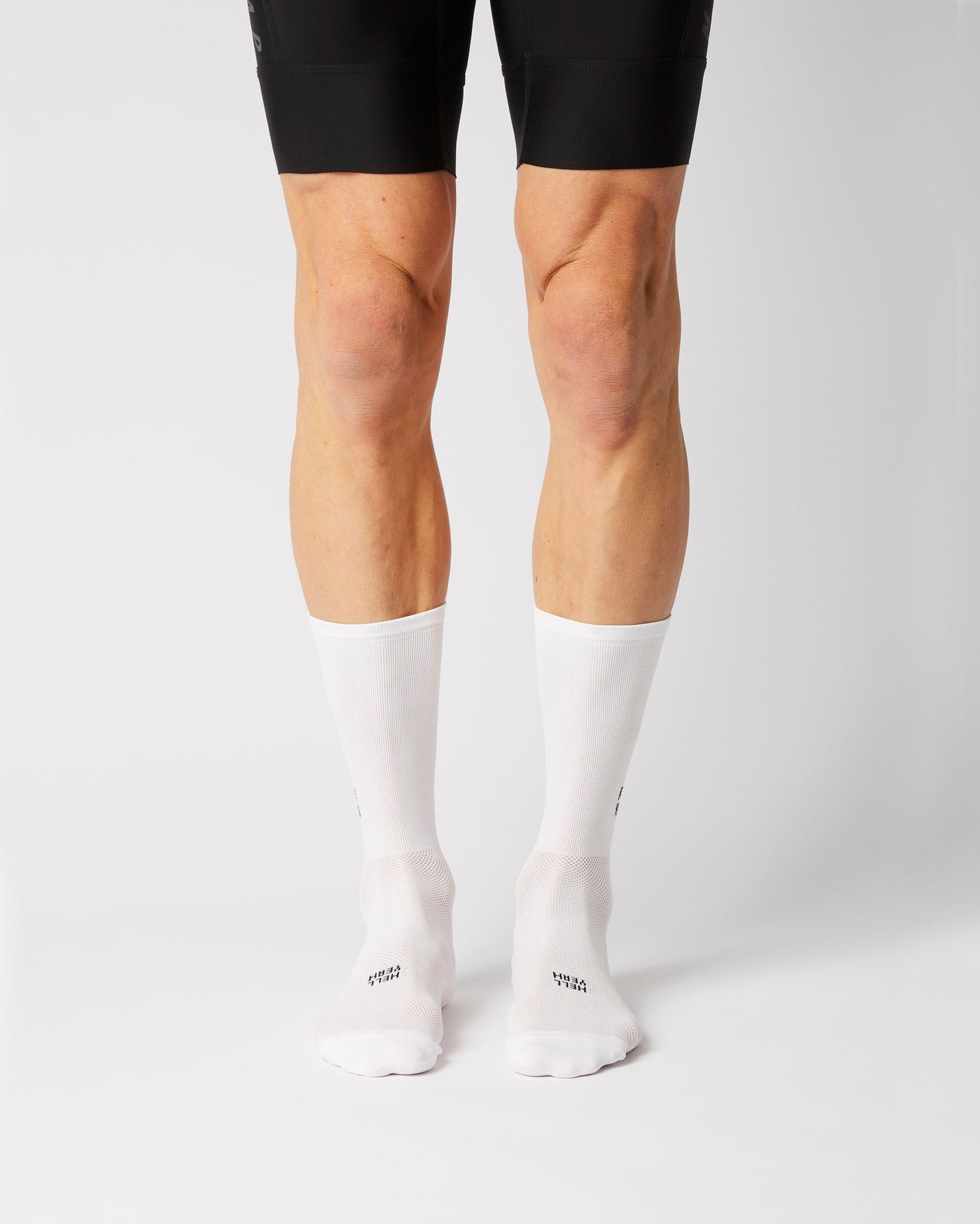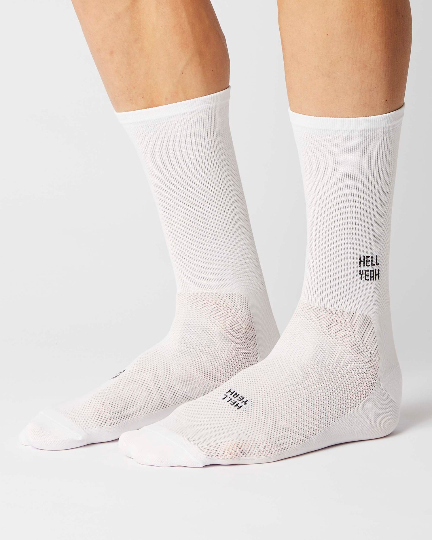 Vælg Hell Yeah, hvis du vil have hvide cykelstrømper, der ser skarpe ud og leverer dag efter dag – til tempo, distancen og alt derimellem.