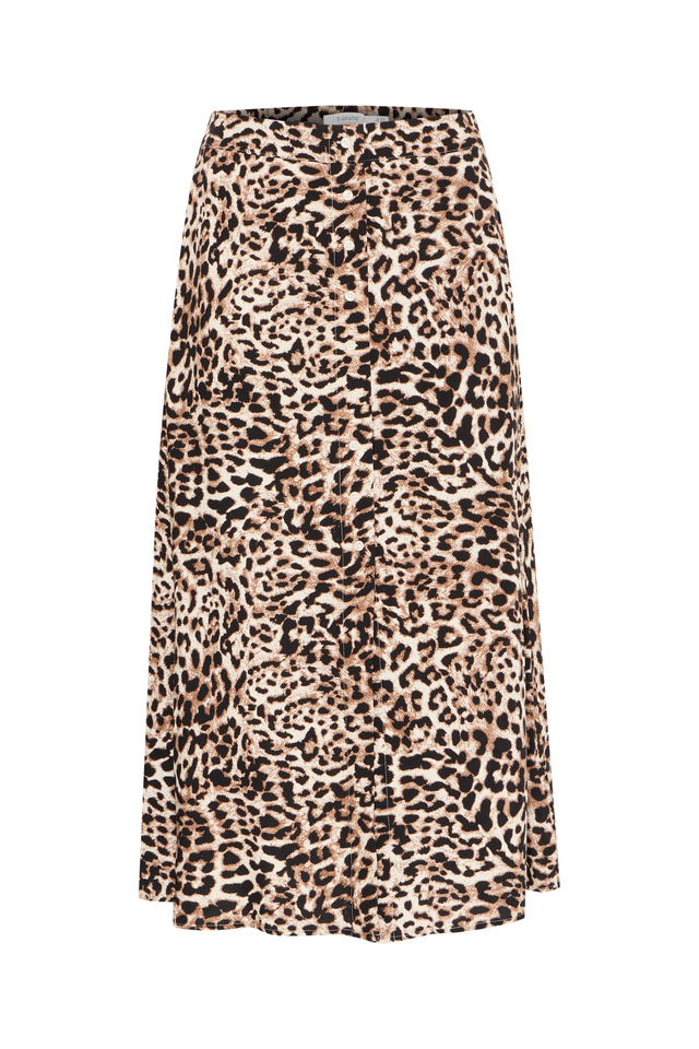 Opgrader din garderobe med denne elegante midi-nederdel fra b.young. Designet i et klassisk A-snit falder nederdelen smukt og giver en flatterende silhuet. Den tidløse "Birch Leopard"-print tilføjer et sofistikeret touch, der gør nederdelen alsidig til både hverdag og fest.