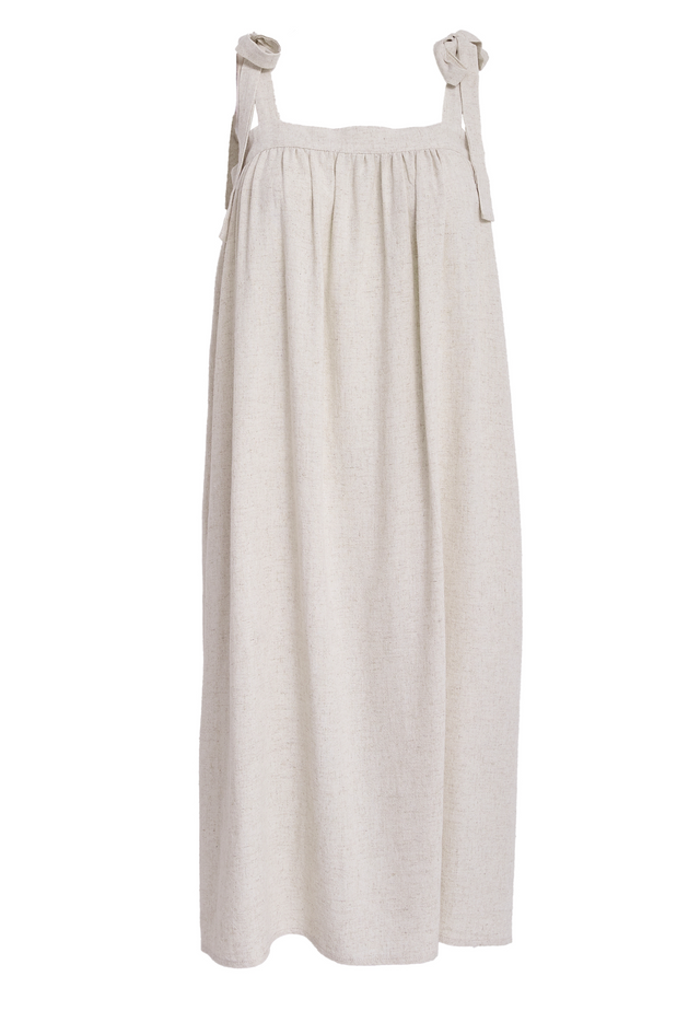 Smuk og enkel kjole fra Desires med fine stropper, der bindes som sløjfer for et feminint touch. Kjolen har en behagelig knælængde og et let, luftigt design, som gør den perfekt til både hverdag, ferie og festlige lejligheder. Fremstillet i en blød og åndbar blanding af viskose og hør, der sikrer komfort hele sommeren. Et must-have til garderoben for varme dage og elegante looks.
