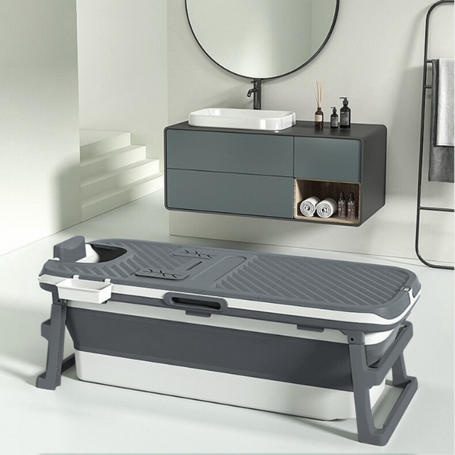 Special edition foldebadekar til voksne med låg, digital termometer og fodmassage - 150cm/Grå XL. Ekstra 300 cm. slange, sort badepude, lækker opbevaringspose samt ekstra prop inkl. Værdi kr. 798,-.
